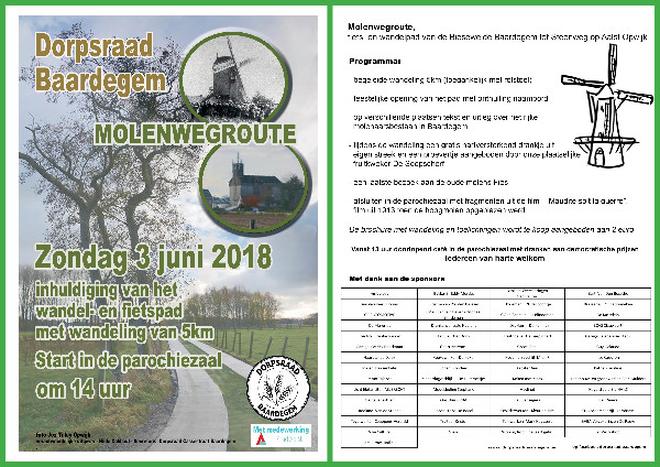 | Omschrijving : | Het fietspad naar Opwijk is afgewerkt ! Op 3 juni 2018 voorzien we de inhuldiging van de Molenwegroute. Afspraak op het dorpsplein vanaf 14.00 uur voor een mooie wandeling. Onderweg voorzien we een hartversterkertje ! Maar liefst 4 schepenen vonden onze activiteit "Inhuldiging van de Molenwegroute" interessant genoeg om aanwezig te zijn samen met een hele grote groep deelnemers. Leuke namiddag ! Fotoos in bijlage. Van de brochure "Molenwegroute" wandel-en fietspad zijn er nog een aantal over. Kostprijs 2 euro